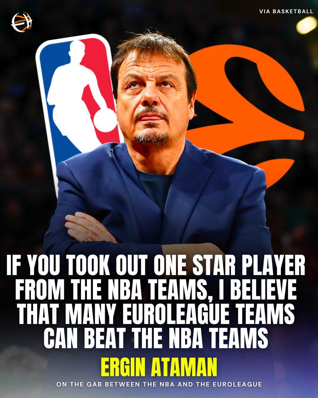 阿塔曼认为,如果从NBA球队中挑走一名明星球员,我相信许多欧洲篮球联赛球队都可以击败NBA球队。阿塔曼表示:“我记得两三年前的季前赛,欧洲篮球联赛球队和NBA球队之间有很多比赛。如果我没记错的话,70%到80%的比赛,欧洲篮球联赛的球队都赢了。NBA球队和欧洲篮球联赛球队之间并没有太大区别。恕我直言,NBA有很多明星球员,他们都是真正的明星球员,比如勒布朗、杜兰特、库里,如果你把其中一位排除在外,很多欧洲篮球联赛的球队都会赢。”